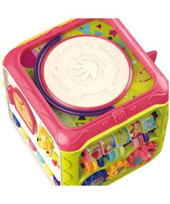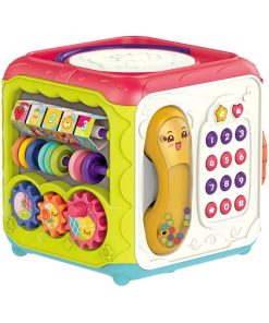 Bộ đồ chơi hình khối đa năng ặt, mỗi mặt là một trò chơi khác nhau như: xoay bánh răng, điện thoại mini, bảng số, cửa mở, và các khối hình lắp ghép.